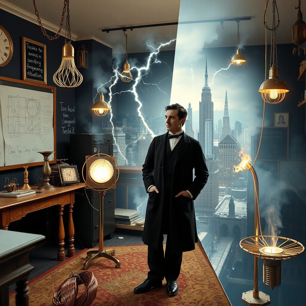This image shows Nikola Tesla standing in his 1890s lab, surrounded by old instruments and schematics, with a glimpse of a futuristic city powered by wireless energy in the background. The scene blends past and future, reflecting Tesla's visionary ideas about energy and frequency.