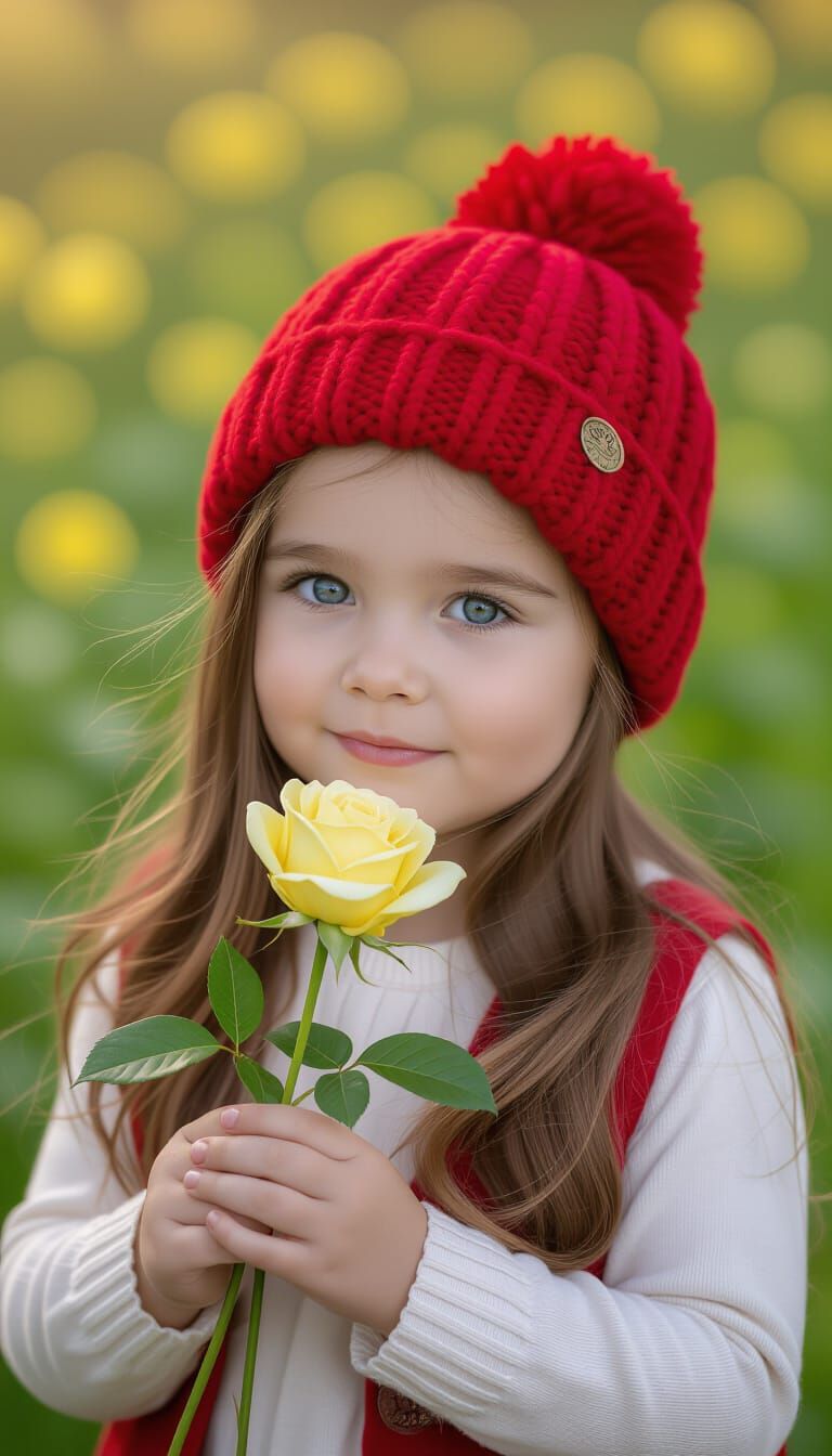 A hyperrealistic studio portrait of a beautiful young girl with long, lavender hair, smelling a yellow rose in an enchanted garden. Features soft, misty lighting and vibrant colors.
