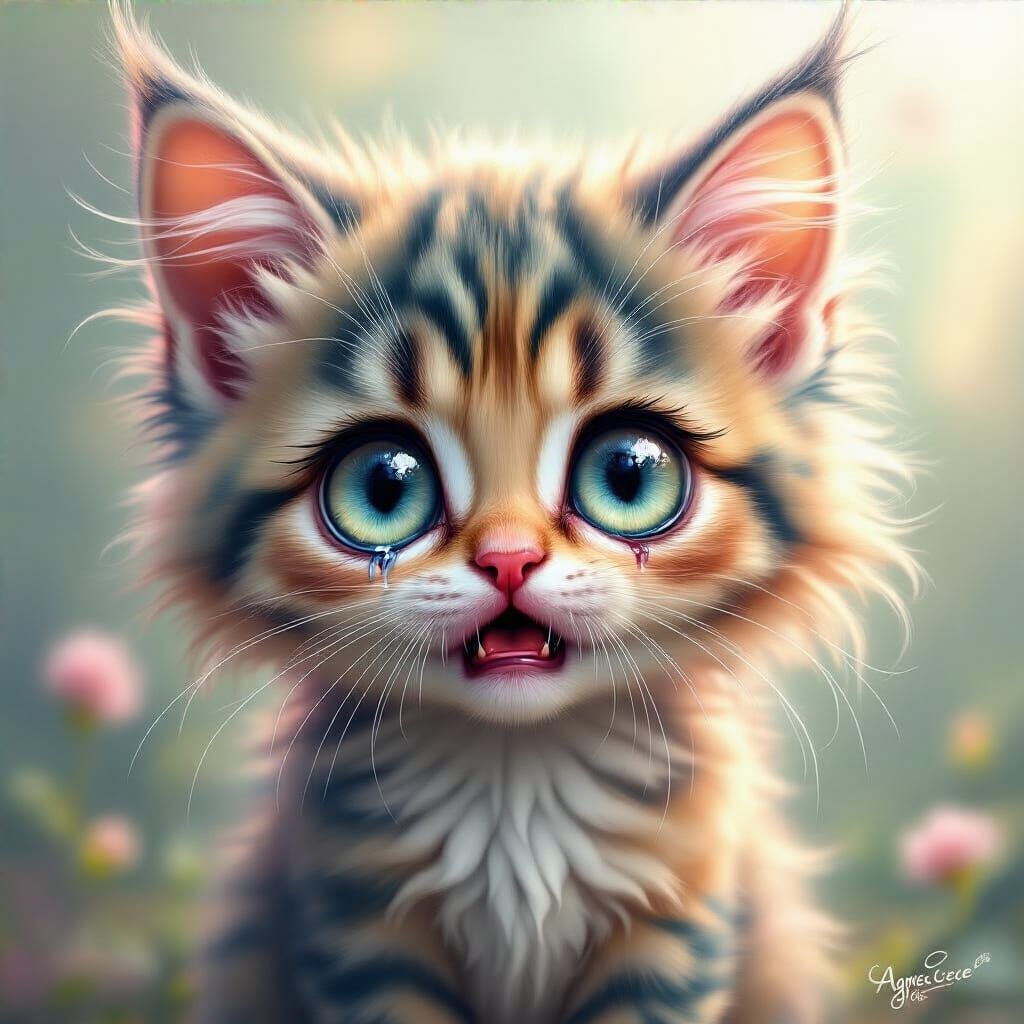 This image shows a fluffy, multi-colored kitten with huge, sad eyes and a quivering chin. Rendered in a whimsical digital painting style with soft pastel colors and luminous lighting.