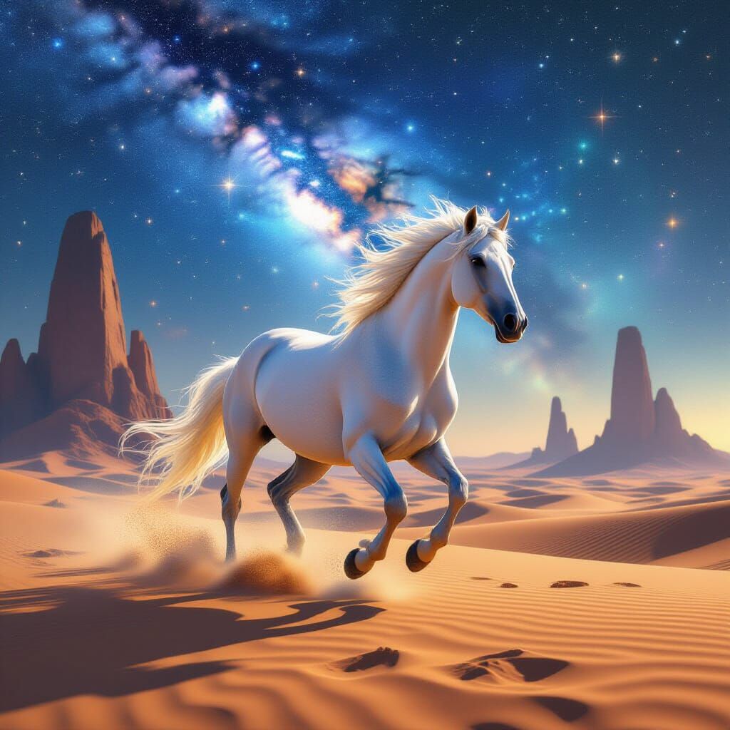 A majestic white horse with a starlight mane traverses a shimmering desert under alien constellations. Hyperrealistic digital matte painting style with surrealist influences.