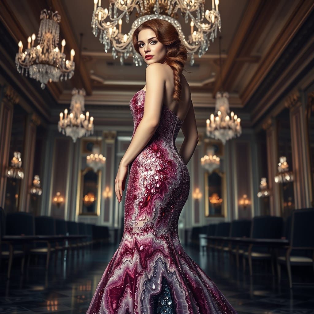 This image showcases a woman in a stunning, crystal-encrusted evening gown, surrounded by opulent furnishings and chandeliers, exuding luxury and elegance in a cinematic, high-contrast atmosphere
