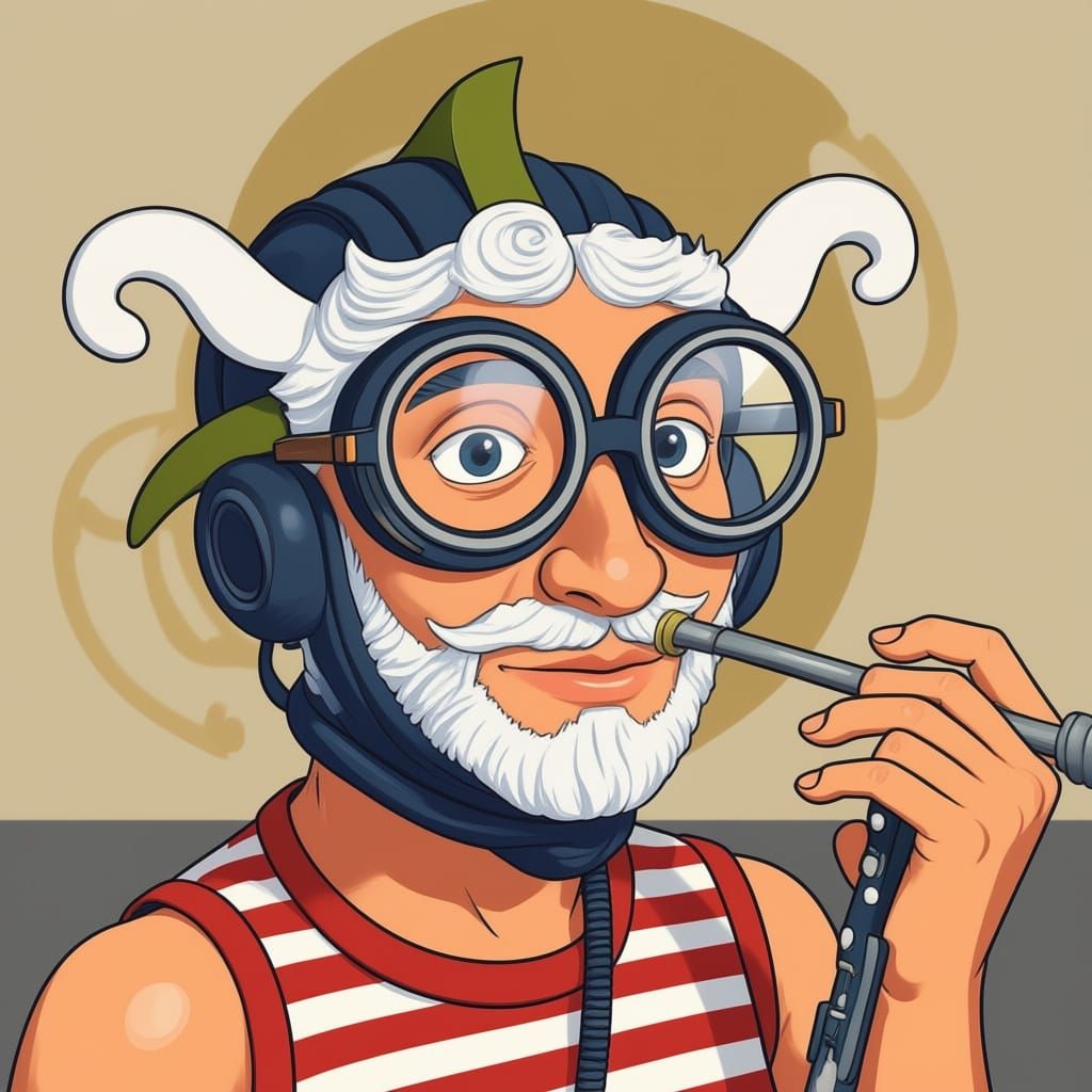 A vibrant and saturated composition featuring a musician playing a saxophone surrounded by golden triangles. Rendered in a style reminiscent of Alfredo Rodriguez's regal portraits with defined lines, created using Cinema 4D.