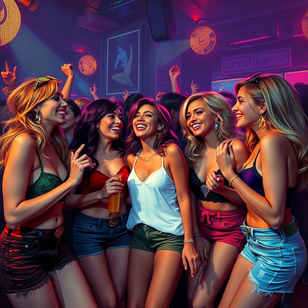 This image showcases a group of stylish young women dancing in a neon-lit nightclub. The vibrant scene captures a dynamic sense of movement and energy, reminiscent of stylized comic art.