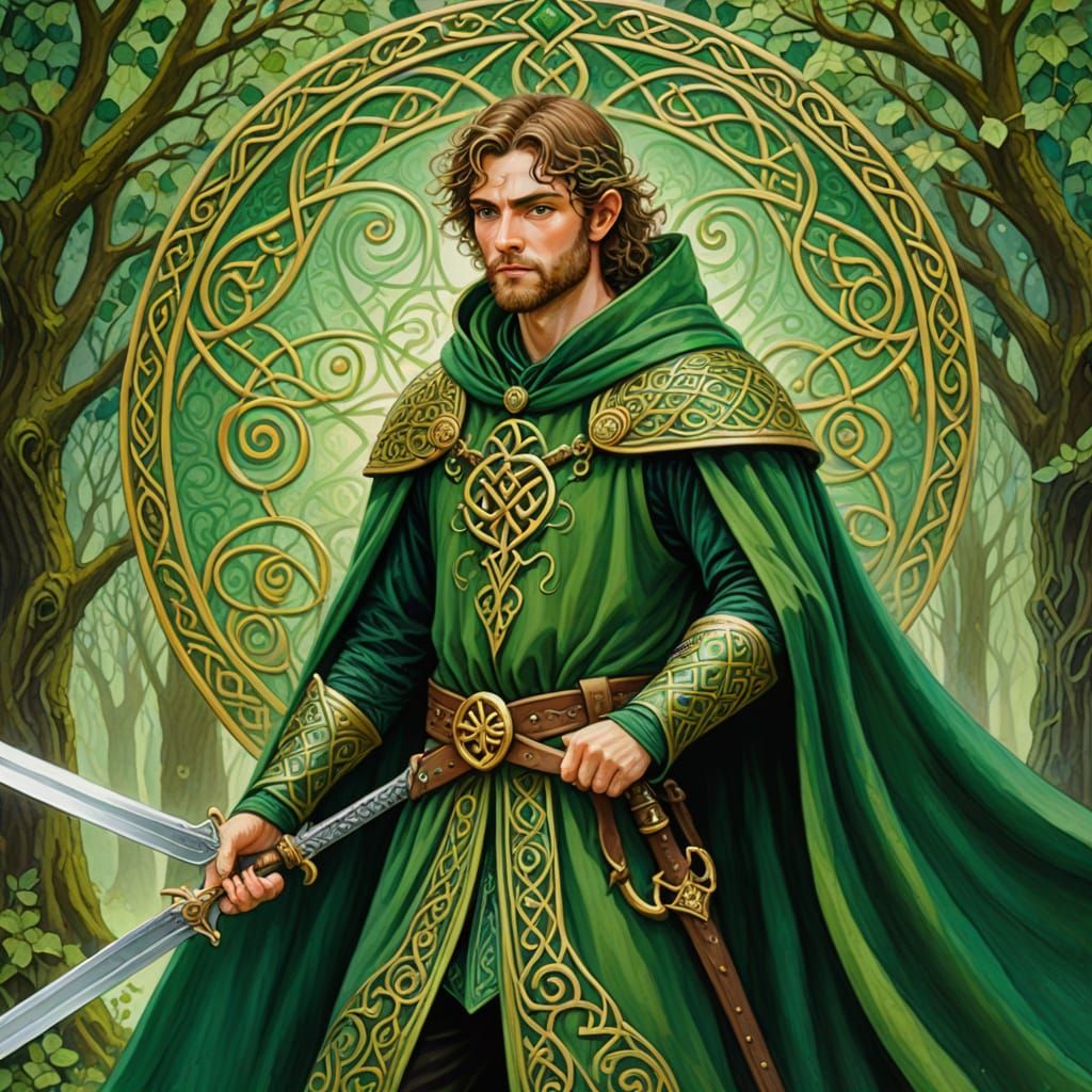 This image shows a handsome Irish fairy warrior standing with his sword on the Emerald Isle. The vibrant gouache painting features golden Celtic knot patterns and soft, warm lighting, creating a mythical scene.