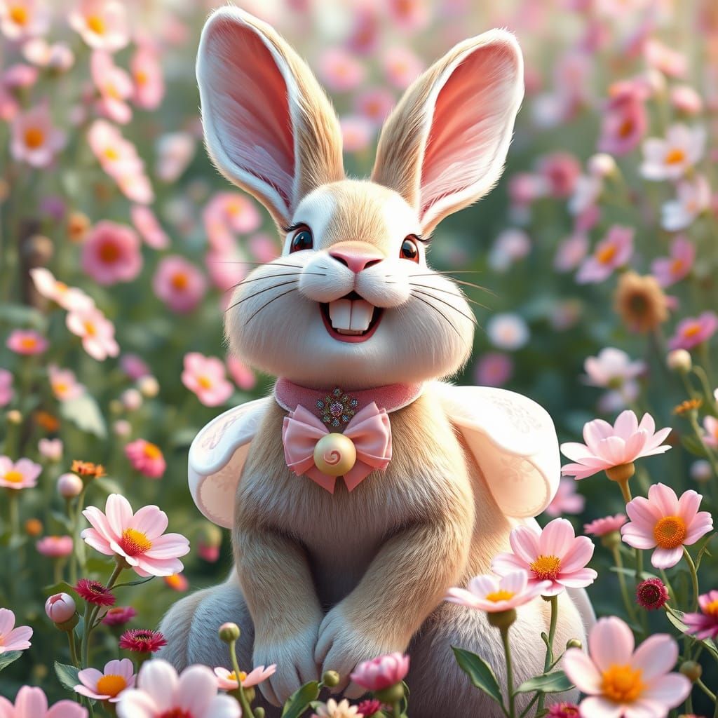 A vibrant image of a smiling bunny dressed in pastel clothing in a flower-filled meadow. The art is rendered in 3D with incredibly detailed textures in a anime style.