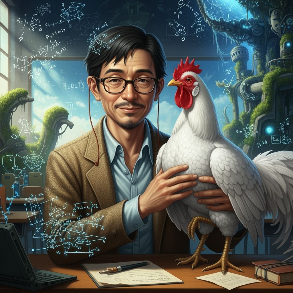 A digital artwork of a high school physics teacher holding his prized Japanese Shamo chicken. The image blends illustrative fantasy with realistic textures.