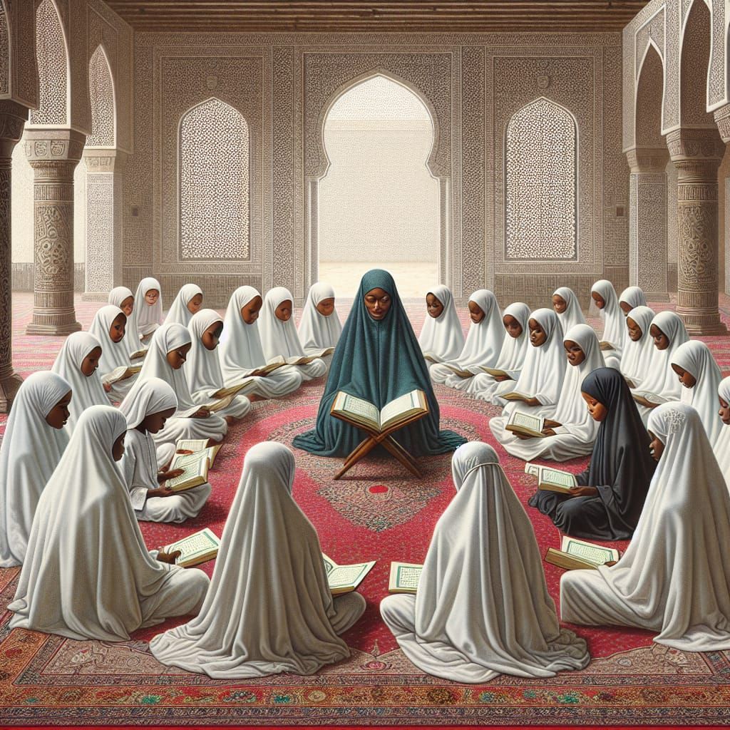 A serene mosque scene depicts Nigerian girls in white abayas, learning the Qur'an from their teacher. This image captures a peaceful moment of religious education, rendered with stippled textures and subtle color gradients.