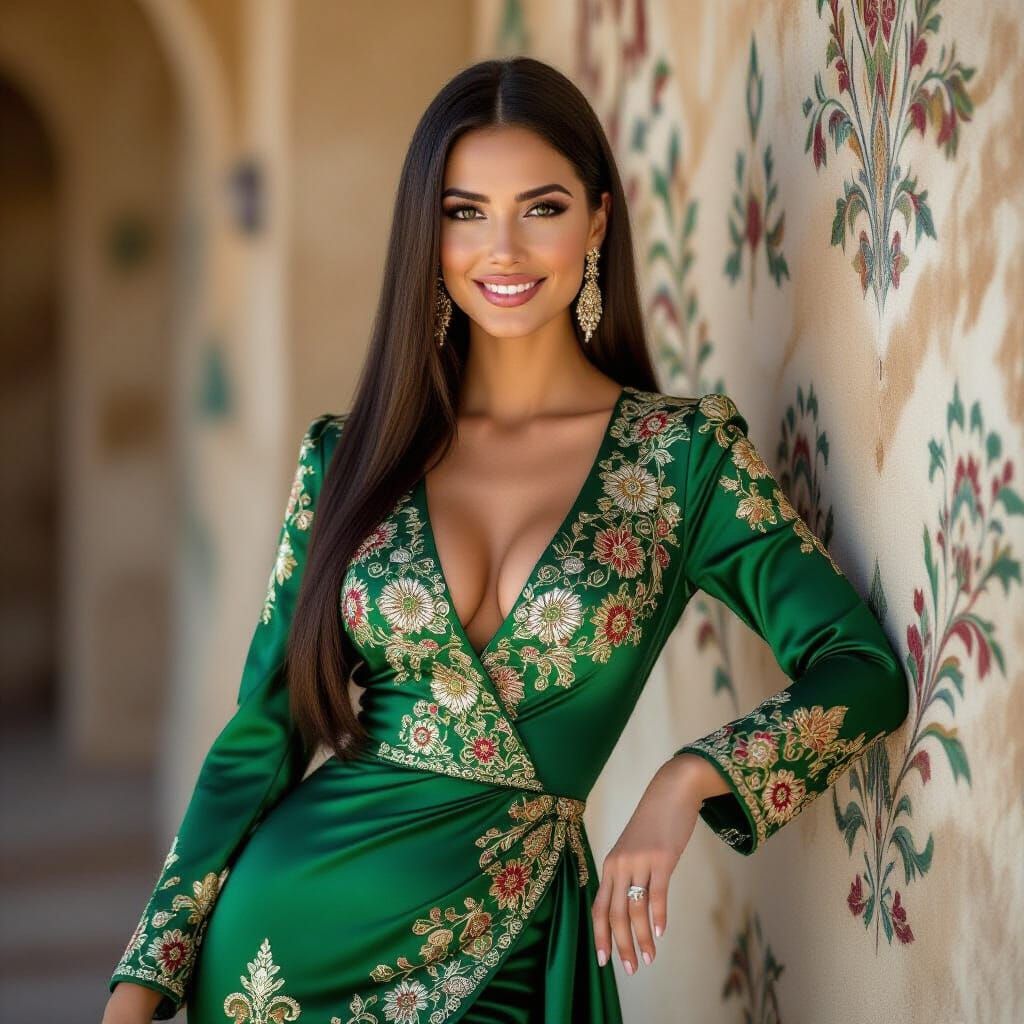 A stunning studio photograph captures an elegant 25-year-old German woman in a shimmering emerald silk dress with gold paisley patterns. Soft lighting highlights her features and the intricate design, creating a sophisticated portrait.
