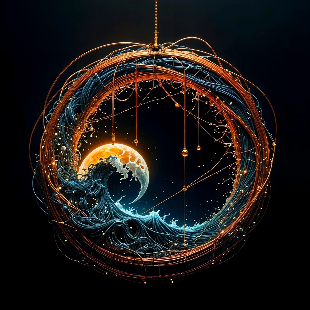 This image shows an intricate landscape of tangled wires and cables forming Victorian villages and bonsai trees inside a metallic moon. The surreal composition features a Yin Yang sun and moon in an electrified atmosphere, rendered in a maximalist style.
