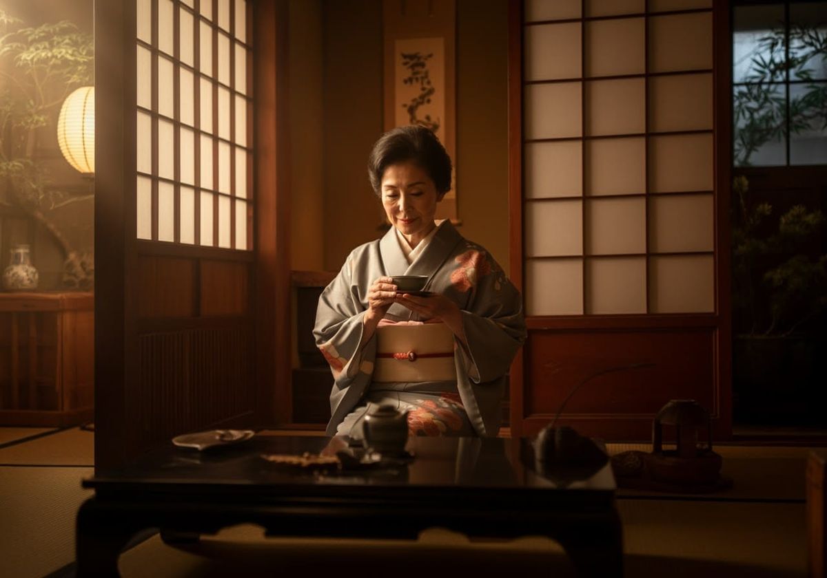 Professional photography of a stunning Japanese woman enjoying a drink in the cozy living room of her traditional home. Super-Hyperdetailed background fitting the character