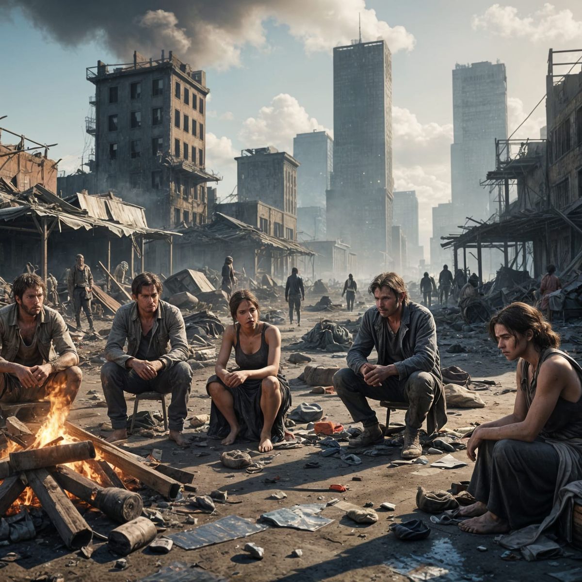 This image shows a group of impoverished people gathered around a fire in a ruined city. The scene evokes a film noir atmosphere with gritty textures, rich colors and side lighting.