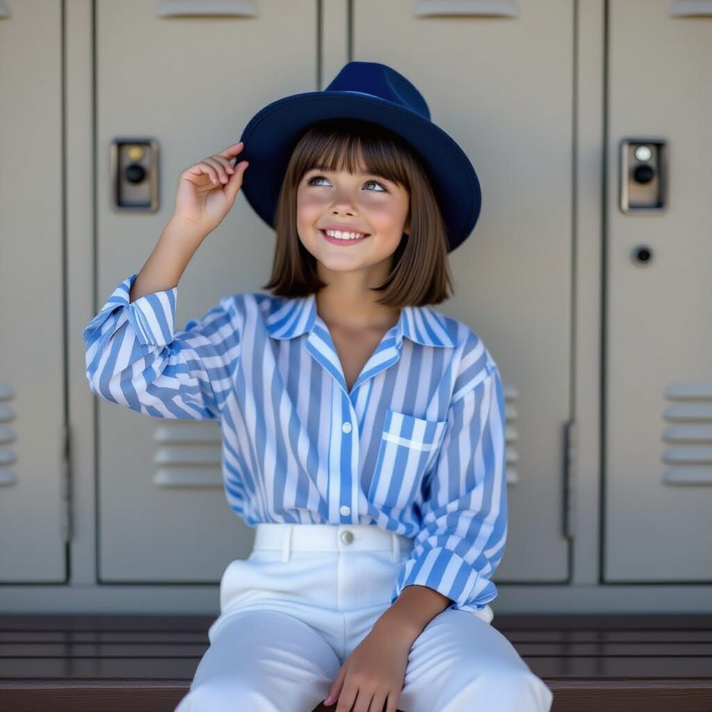 This image shows a skinny 12-year-old French girl sitting on a bench by school lockers. She is wearing a striped blue shirt, white trousers, and adjusting a blue hat, captured with a shallow depth of field and soft natural light.