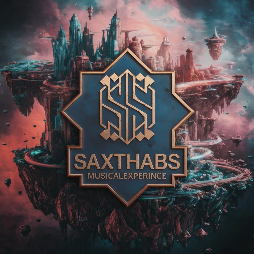 A logo for a music brand set against a surreal cityscape featuring floating islands. The image is a detailed matte painting with a rich, complementary color scheme, rendered in 8k.