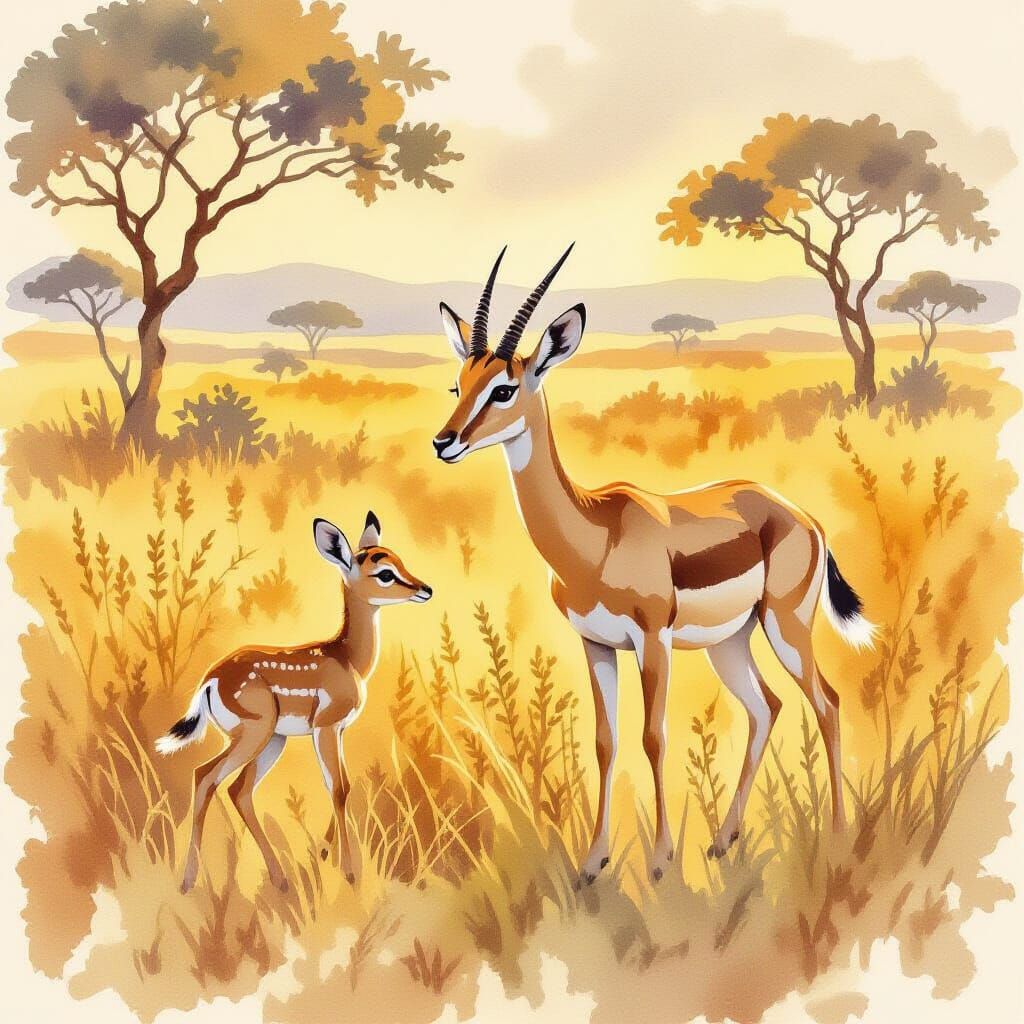 This image shows a mother and baby gazelle frolicking in the African savanna, depicted in a detailed watercolor style with soft, flowing colors and warm golden hour light. Inspired by atmospheric watercolors.
