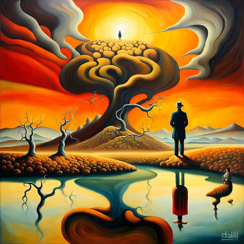 A surreal oil painting of a man standing in a dreamscape with golden light filtering through the mist. The artwork employs intense brushstrokes, rich texture, and vibrant colors.
