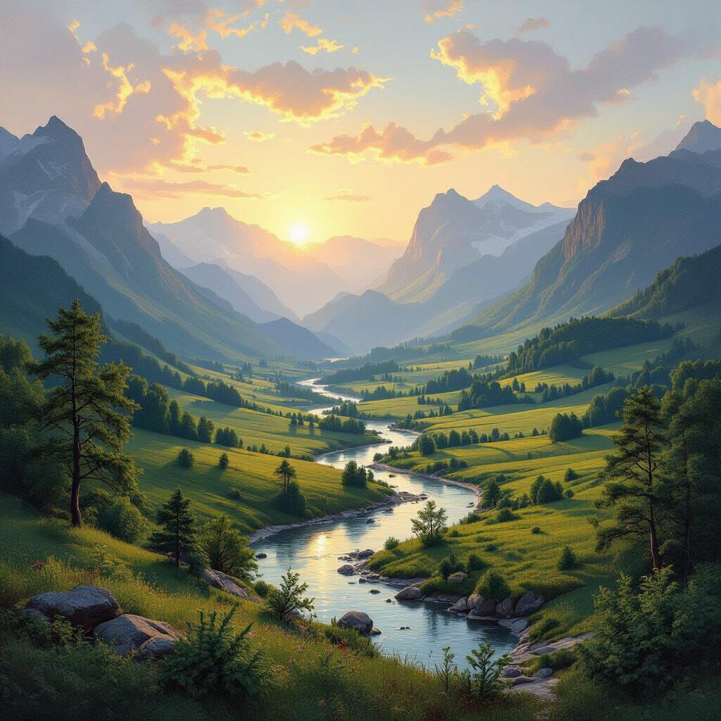 A striking picture of lush valleys and serene rivers beneath majestic mountains. The image evokes the style of 19th-century Romantic painters, with expressive brushstrokes and soft, atmospheric lighting.