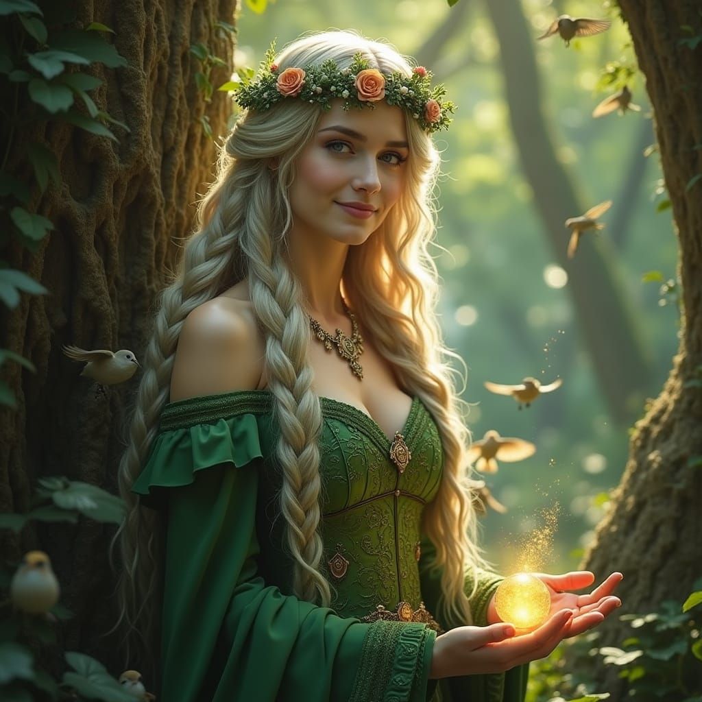 A captivating image of a forest enchantress in a sunlit glade. The figure is adorned with flowing hair and a floral crown, rendered with intricate details and soft, ethereal light in a fantasy style.