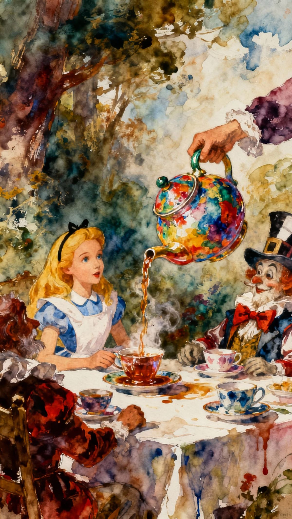 This image shows a vibrant depiction of Alice in Wonderland's Mad Tea Party being poured from a colorful teapot, rendered with dramatic, expressive brushstrokes in an oil painting style.