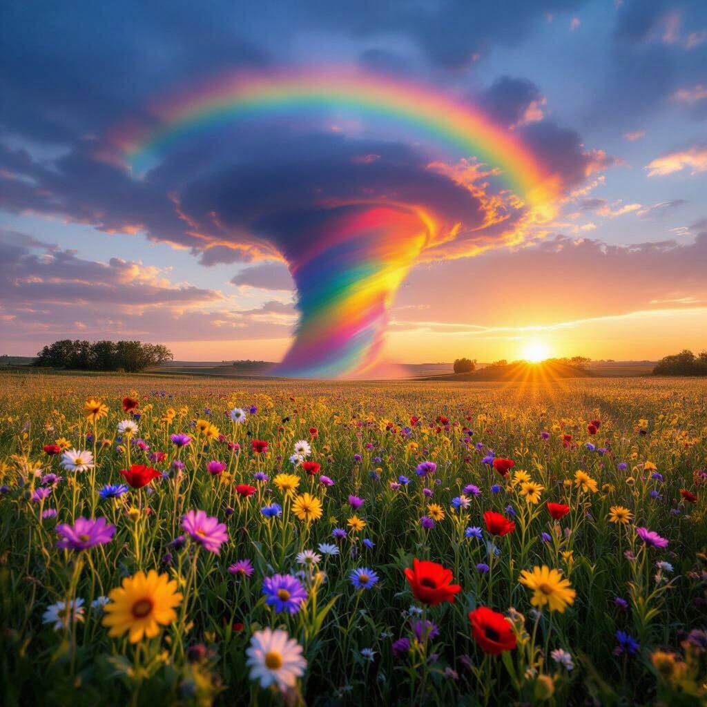 This image shows a rainbow-colored tornado gracefully scattering wildflowers across a meadow at sunrise. The vibrant colors and soft lighting create a dreamy, surreal scene.