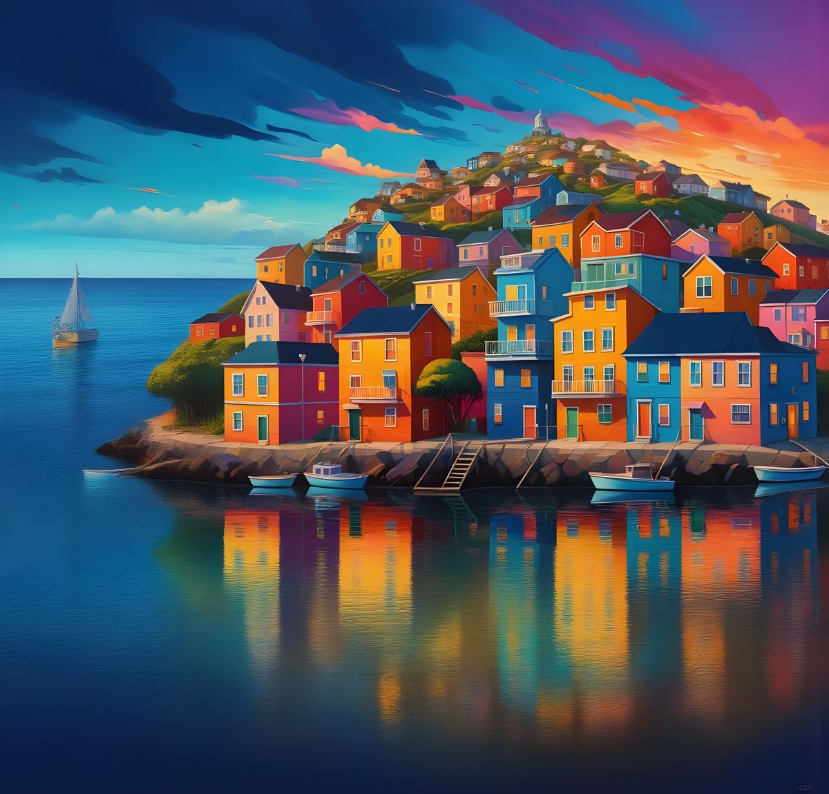 This image showcases a vibrant, abstract cityscape featuring ultra-modern houses perched on a hill by the ocean. Sunset colors in the sky are mirrored in the still water below.