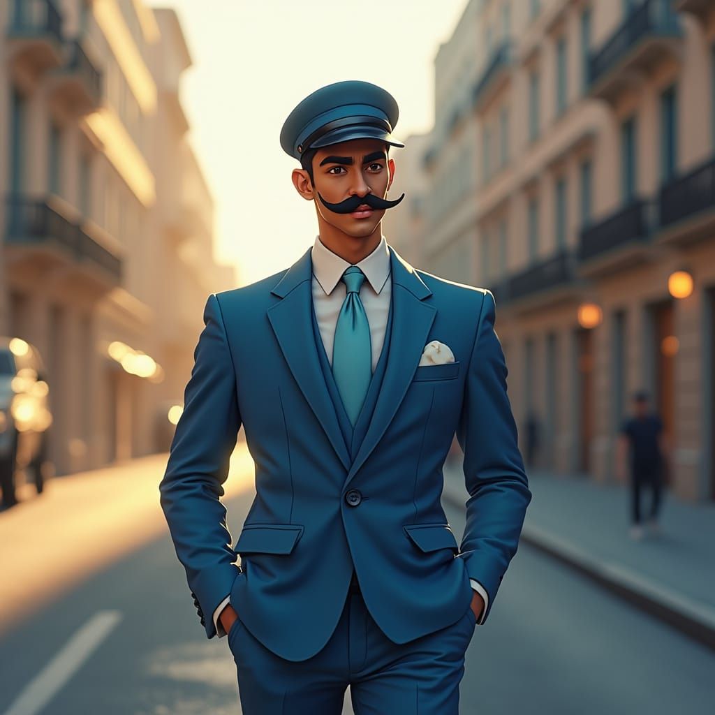 This image showcases a charismatic man exuding confidence as he walks through a pristine city street in the early morning, dressed in a sharp, triadic-colored ensemble. Warm lighting accentuates his features, set against a blurred cityscape with intricate textures and vibrant colors.