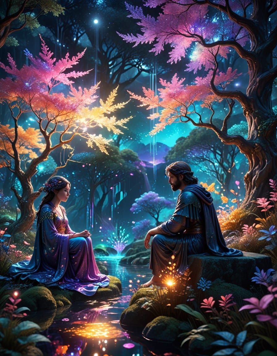 This image captures two mythical beauties in a vibrant, psychedelic fantasy world, surrounded by bioluminescent flora and surreal trees, with intricate geometric linework and holographic colors.