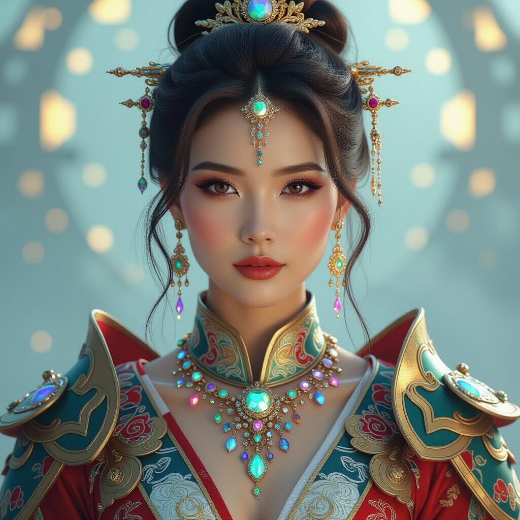 This image shows a beautiful woman with glowing skin wearing a mix of Asian silk garments and futuristic armor. The hyperrealistic digital art features holographic jewelry and crystalline elements.