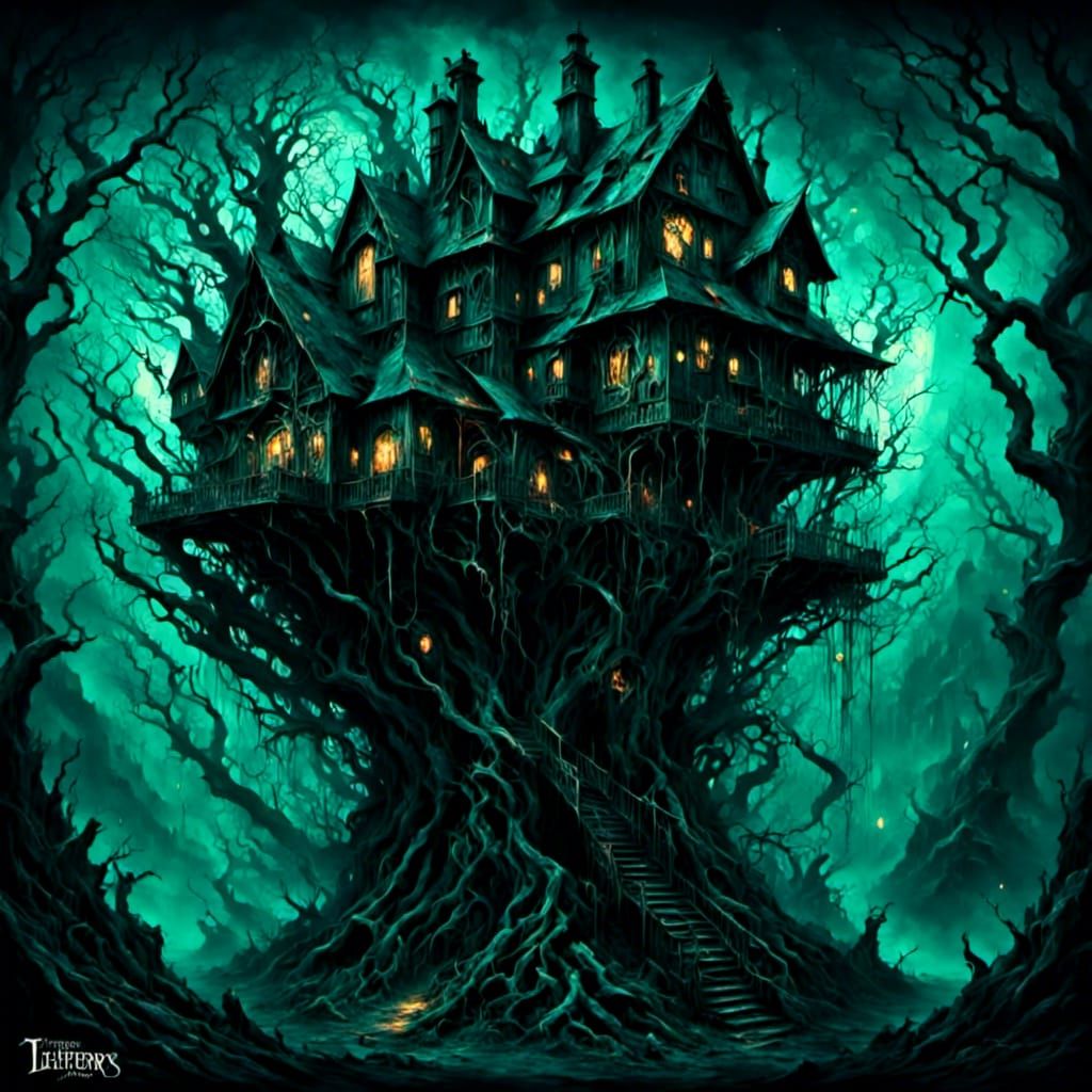 This image shows a stunning treehouse that glows with internal spectral lighting. The scene has a macabre aesthetic and is enhanced with hexed and vexed elements.