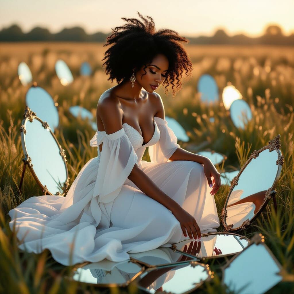 A striking picture of a Black woman kneeling in a surreal landscape of broken mirrors. Clad in white, she restores the fragments with a soft, radiant glow in an afrofuturist aesthetic.