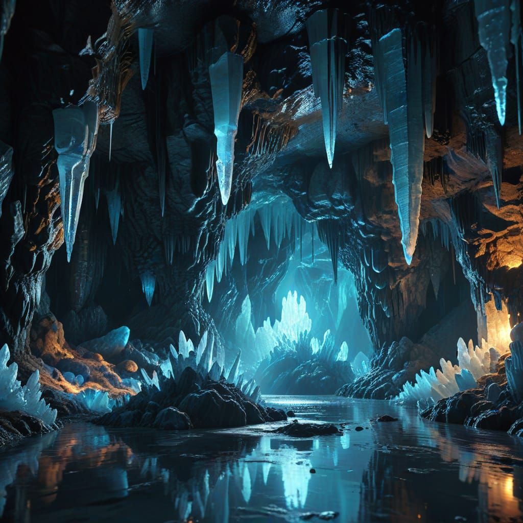 A cinematic view of a cave filled with icy formations and glowing blue water. The digital art features frosty textures, dynamic lighting, and complementary colors. The image is hyper-realistic.