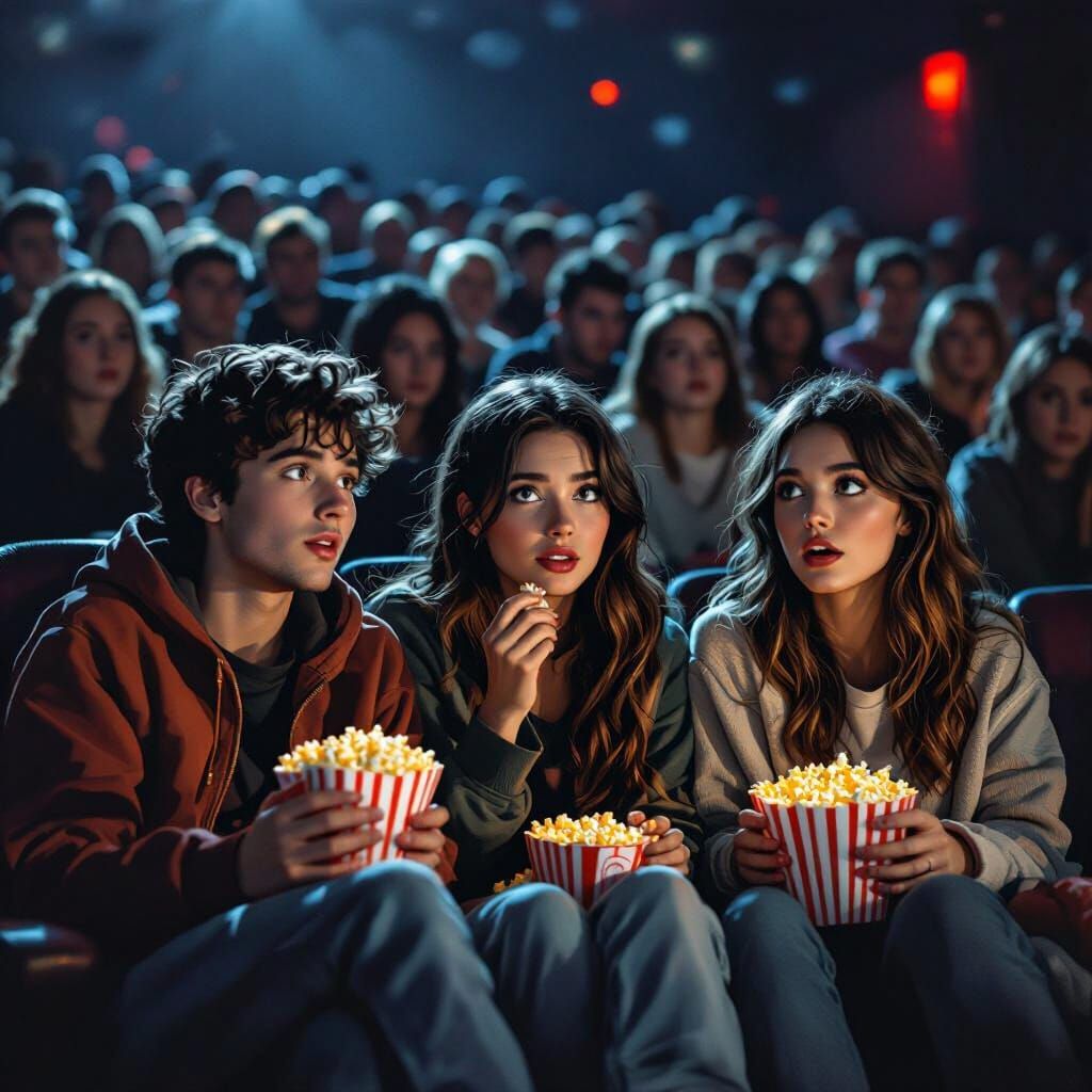 Four friends enjoy popcorn at a dimly lit cinema while watching a scary movie. The scene captures a digital painting with film noir elements, evoking intense atmosphere.