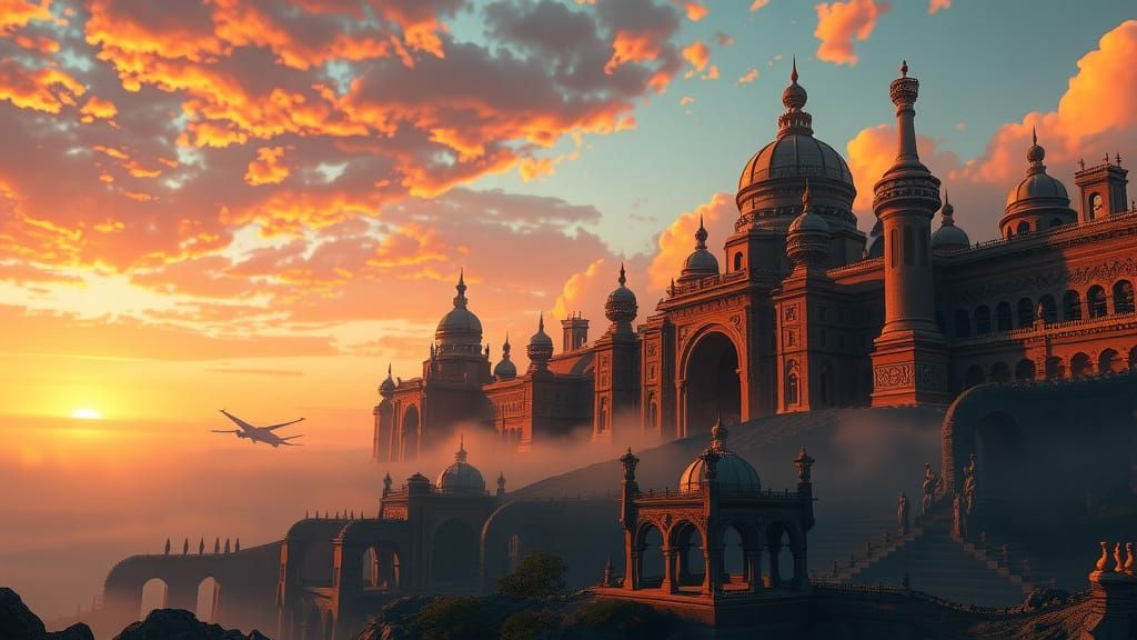 This image shows a breathtaking ethereal dawn landscape with intricate architecture, shimmering deep colors, and dreamlike scenery, reminiscent of fantastical concept art in a highly detailed matte painting style.
