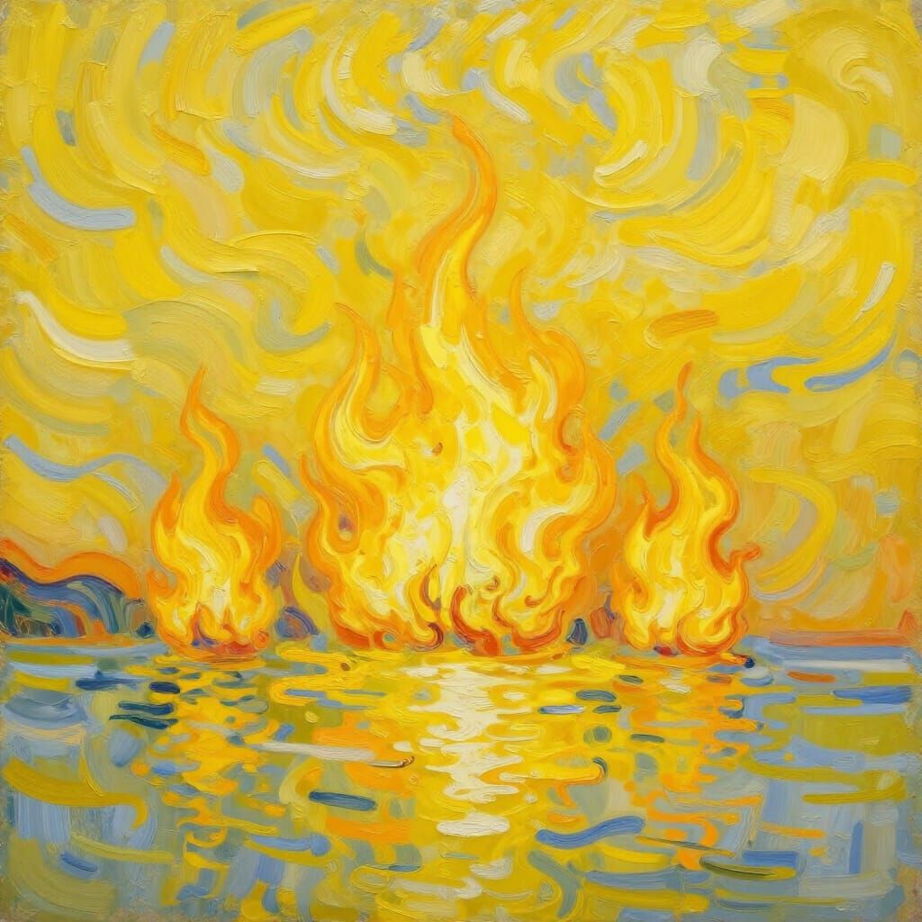 This abstract expressionist artwork showcases a vibrant yellow landscape with fiery elements and water reflections, rendered with energetic brushstrokes and intense color.