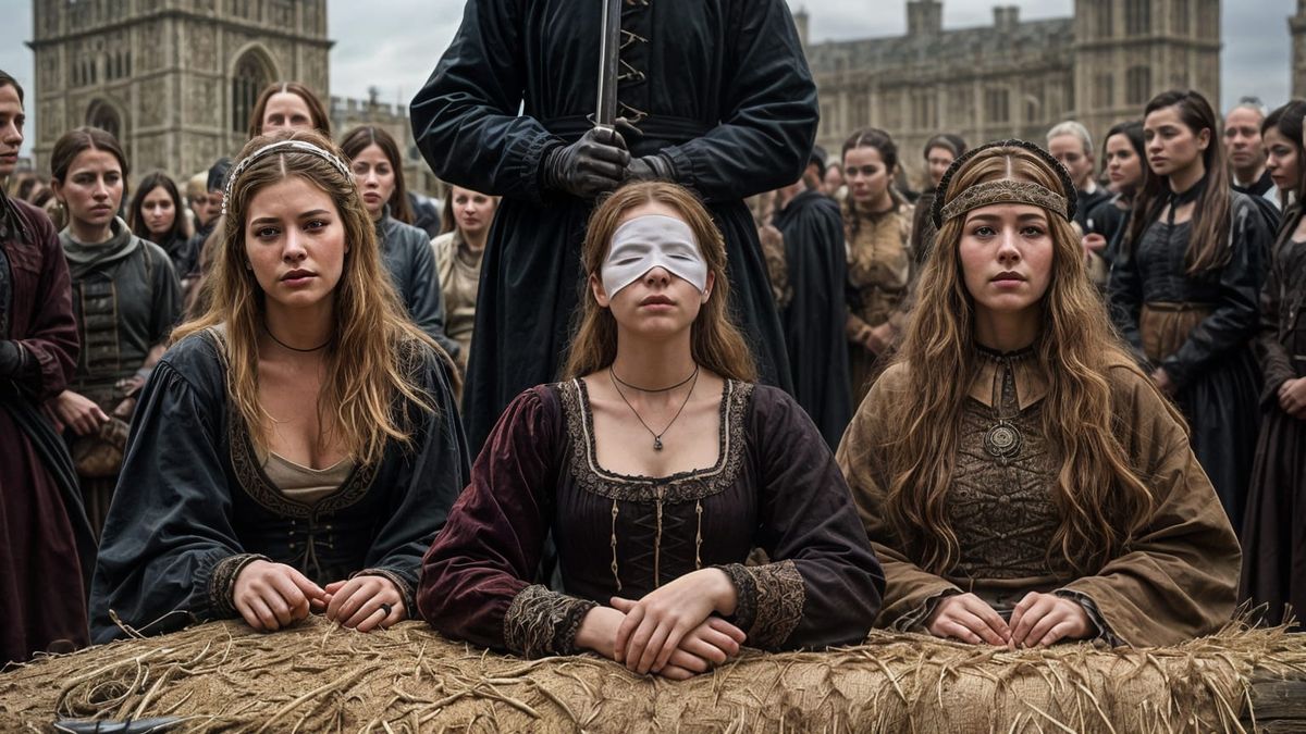 A poignant depiction of Anne Boleyn kneeling blindfolded on a straw-covered scaffold, surrounded by her sorrowful ladies-in-waiting and an ominous swordsman, with the Tower of London behind.