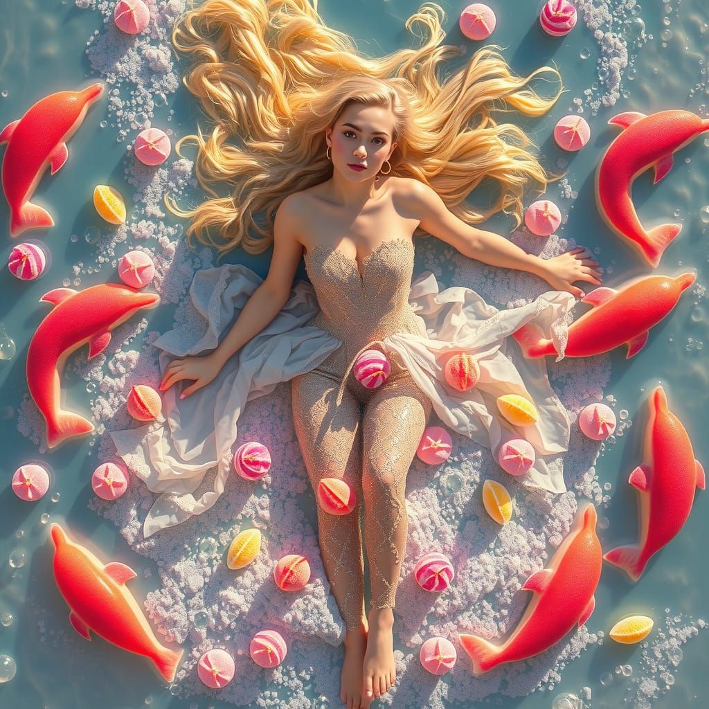 A surreal image of a serene woman with golden hair floating on a soda sea. Gummy dolphins and hard candies surround her in a confectionary wonderland, rendered with vibrant colors and whimsical details.