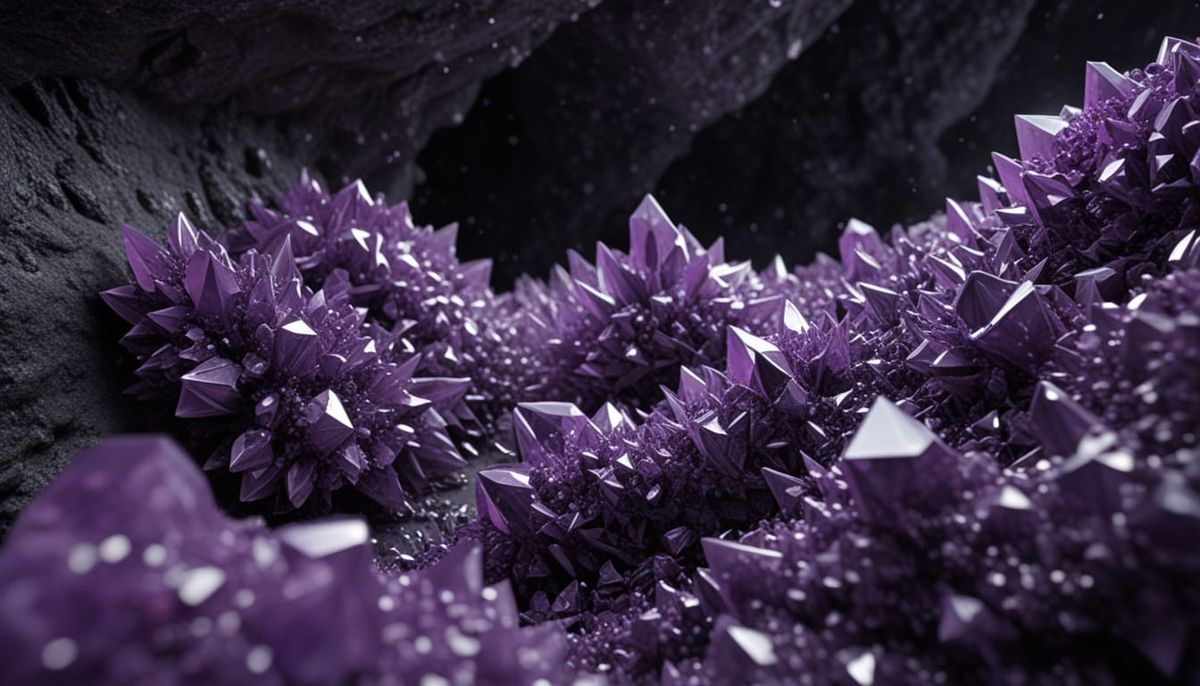 This image showcases intricate, glowing crystal formations with fractal patterns in a deep purple and silver cave. Digital art with vibrant, psychedelic metallic sheens and volumetric lighting.