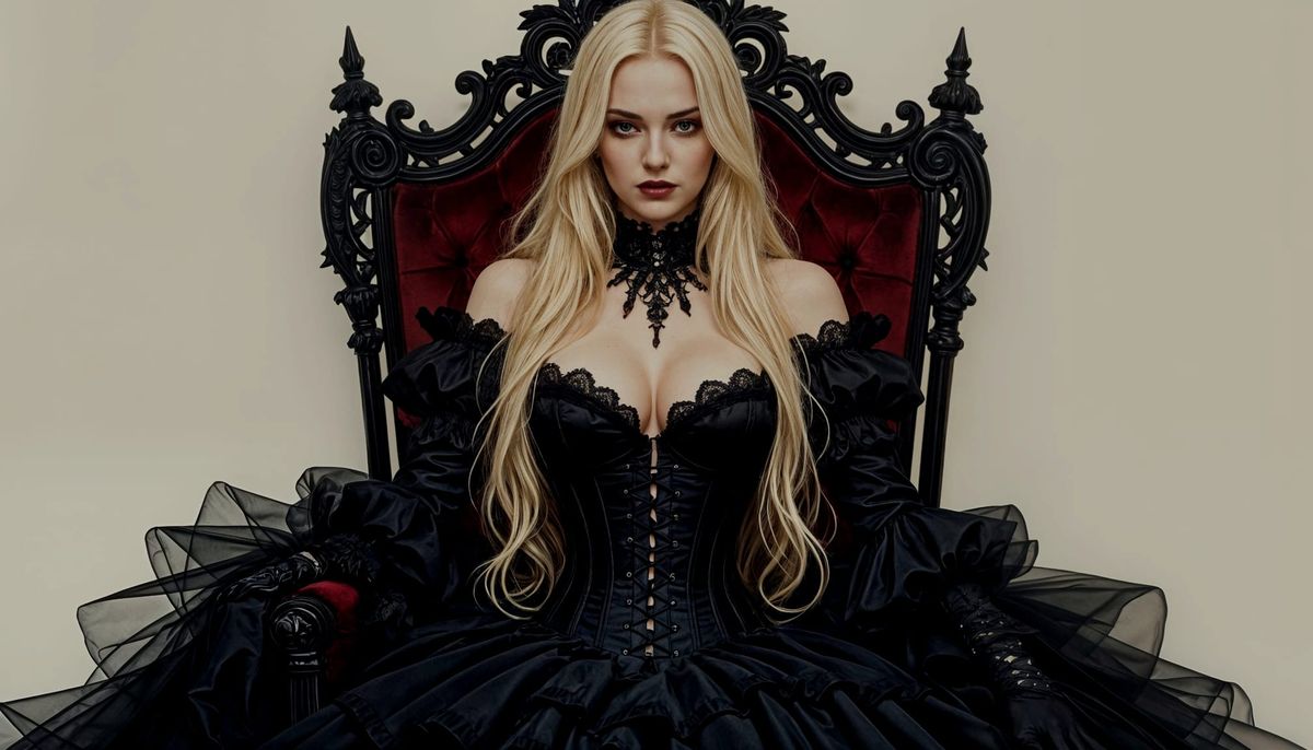 This image shows a tall goth woman with long blond hair, seated for a portrait. The woman wears an accentuating black bustier and corset in this striking image.