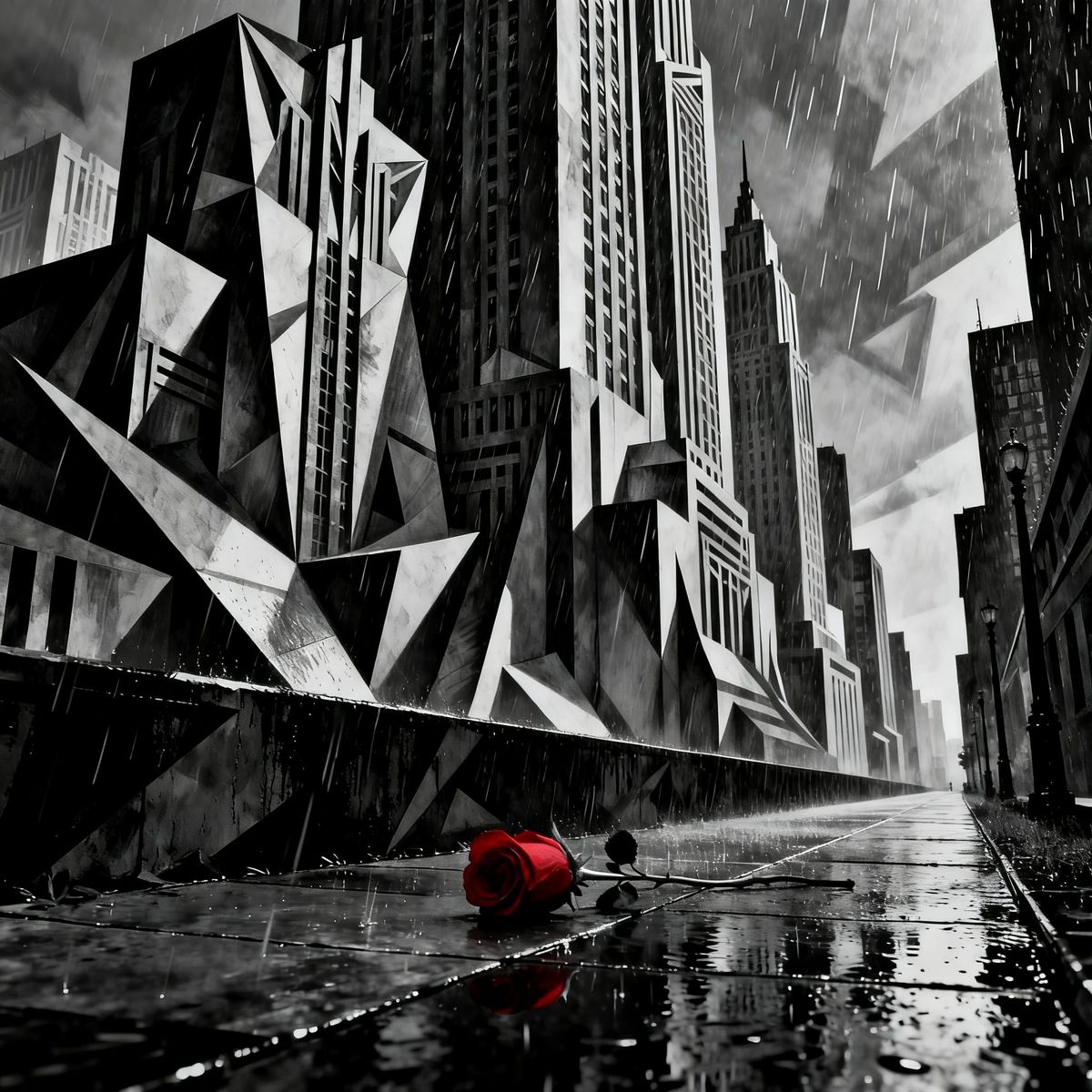 A striking black and white close-up of a rain-soaked sidewalk in a massive 1920s art deco city, inspired by German expressionist film.