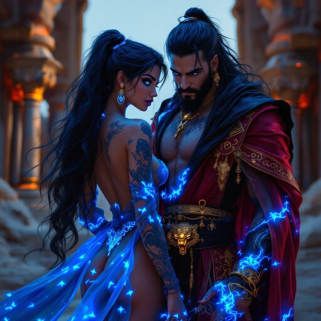 This image shows a dark, mystical scene of a princess in a blue genie suit, surrounded by desert landscapes and eerie bioluminescent tattoos. Her raven-hair and blue eyes stand out against the dark backdrop, with a majestic panther tattoo and a handsome male figure in the background, donning intricate ro...