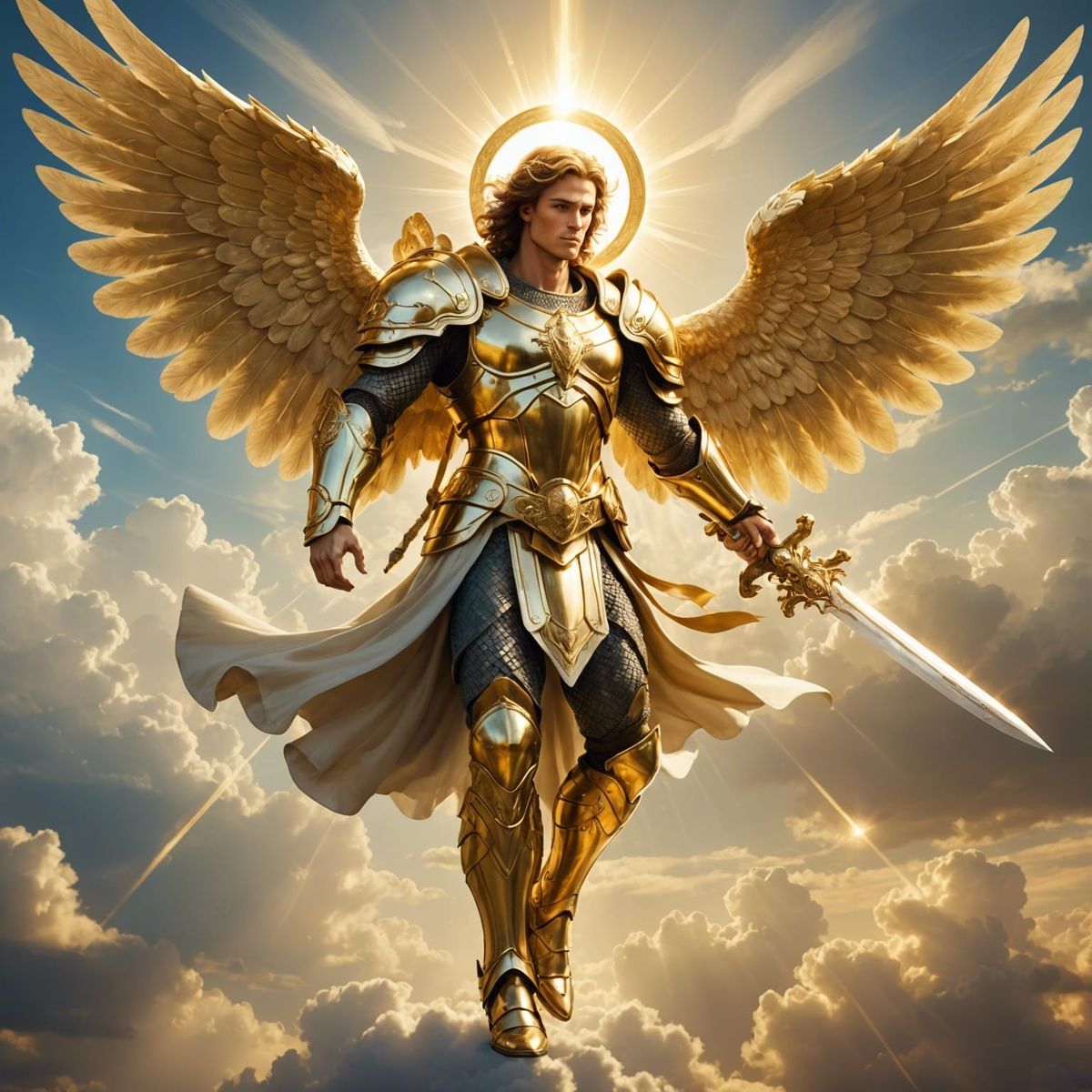 This image depicts Archangel Raphael in golden armor, soaring through the clouds. The divine figure holds a sword and shield, framed by a golden halo and heavenly sunshine.