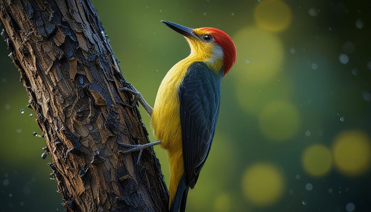This hyperrealistic concept art features a yellow-throated woodpecker on a branch, with vibrant, shimmering feathers and dew drops on the bark, rendered with dramatic side lighting and subtle bokeh.