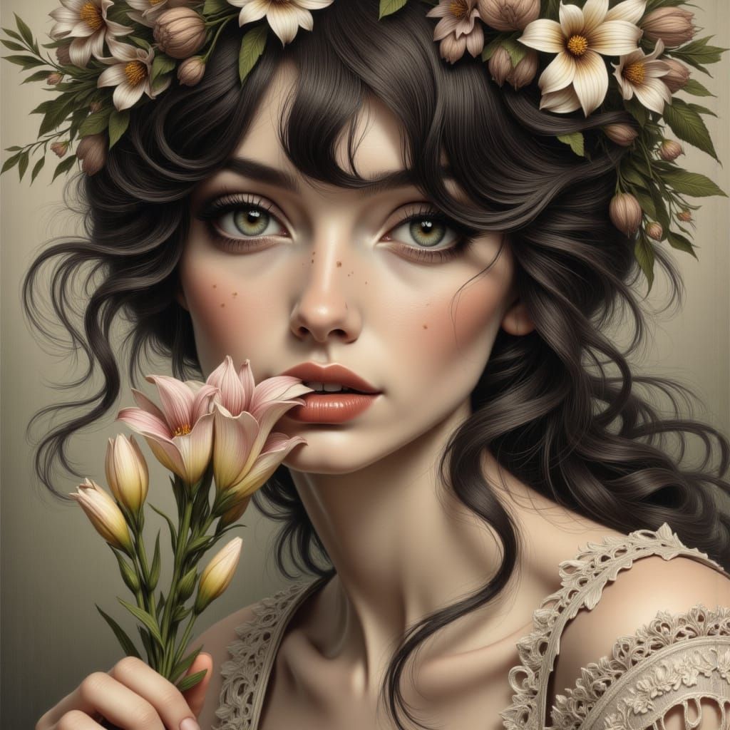 A beautiful woman with dark hair holds a lily to her face. This drawing captures the essence of Art Nouveau, with organic curves, intricate details and elegant lines rendered in charcoal and pencil.
