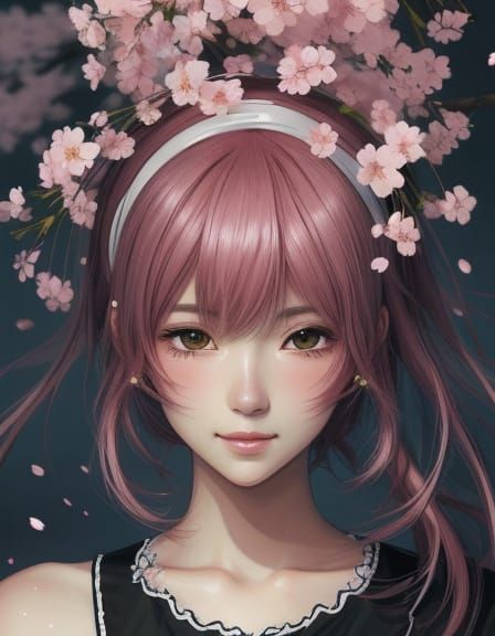 A highly detailed digital painting of a beautiful anime girl with flowing pink hair and sparkling eyes. Features delicate facial details, a gentle smile, and a soft, pastel color palette with cherry blossoms.
