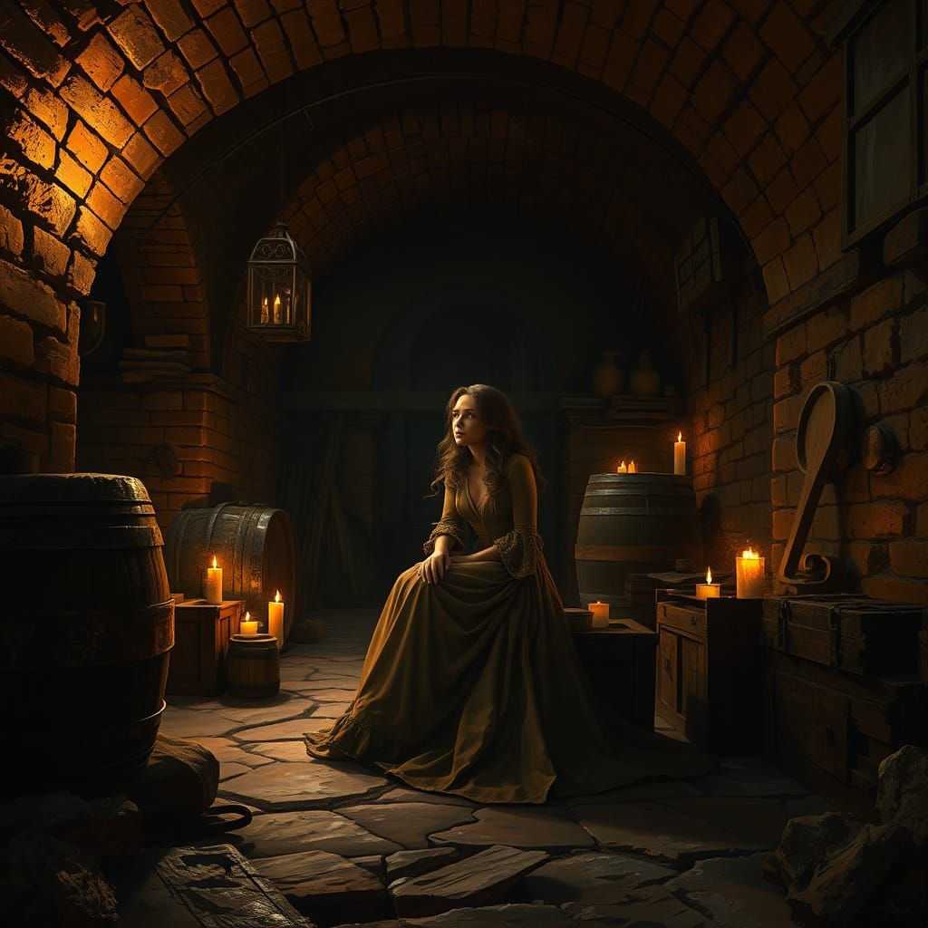 A woman in a flowing dress sits in a rustic brick cellar, illuminated by warm candlelight, surrounded by old barrels and crates. The image features intricate textures and atmospheric lighting.