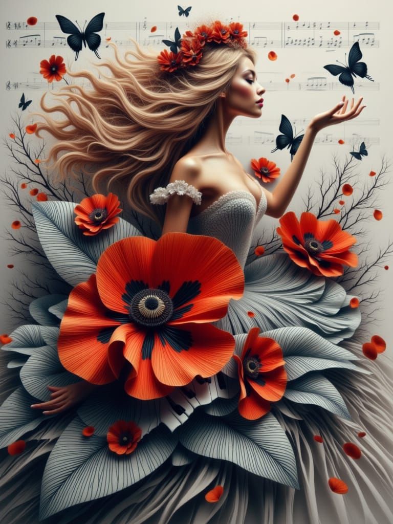A portrait of a woman with flowing hair and a crown of black poppies. The image is reminiscent of romantic art with hyper-realistic textures and a dreamy, painterly aesthetic.