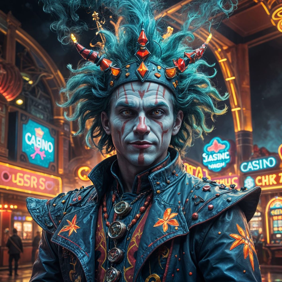This image shows a vibrant casino scene with a jester at its center, surrounded by neon lights and action-packed gamblers. The scene is a dynamic mix of comedy and tragedy, with a focus on the excitement of high-stakes gaming.