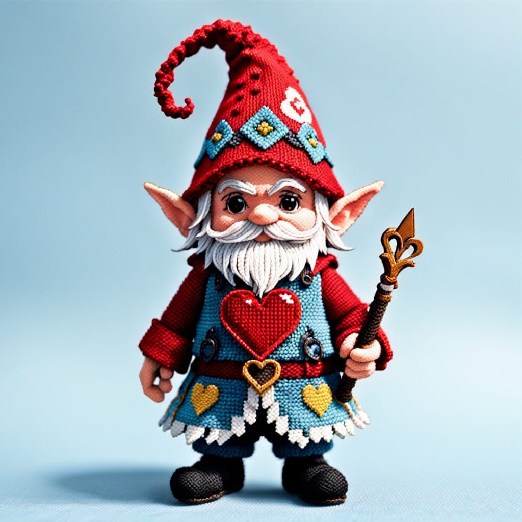 This image features an anime-styled gnome in a red heart costume. The artwork is reminiscent of intricate needlepoint, with a focus on detailed textures and bright colors.