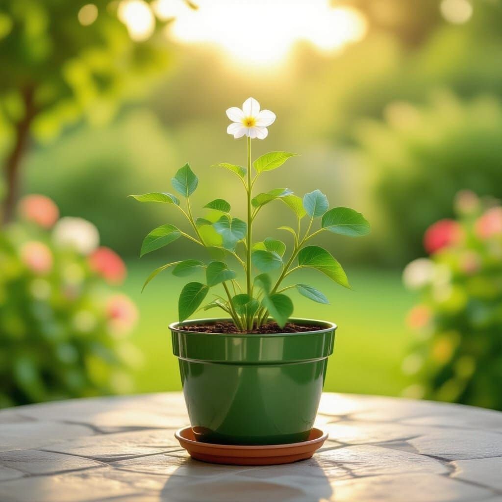 This image shows a lush green potted plant with a single flower on a sunny patio. It is illustrated in a realistic botanical art style with fine detail and soft washes.