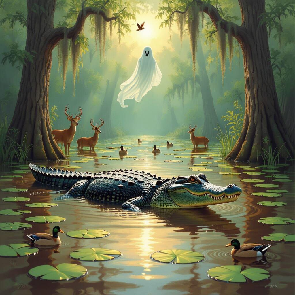 This image shows a large alligator swimming through a murky swamp, as deer hide among the cypress trees. Sunlight streams through the foliage in this vibrant, dreamy landscape painting.