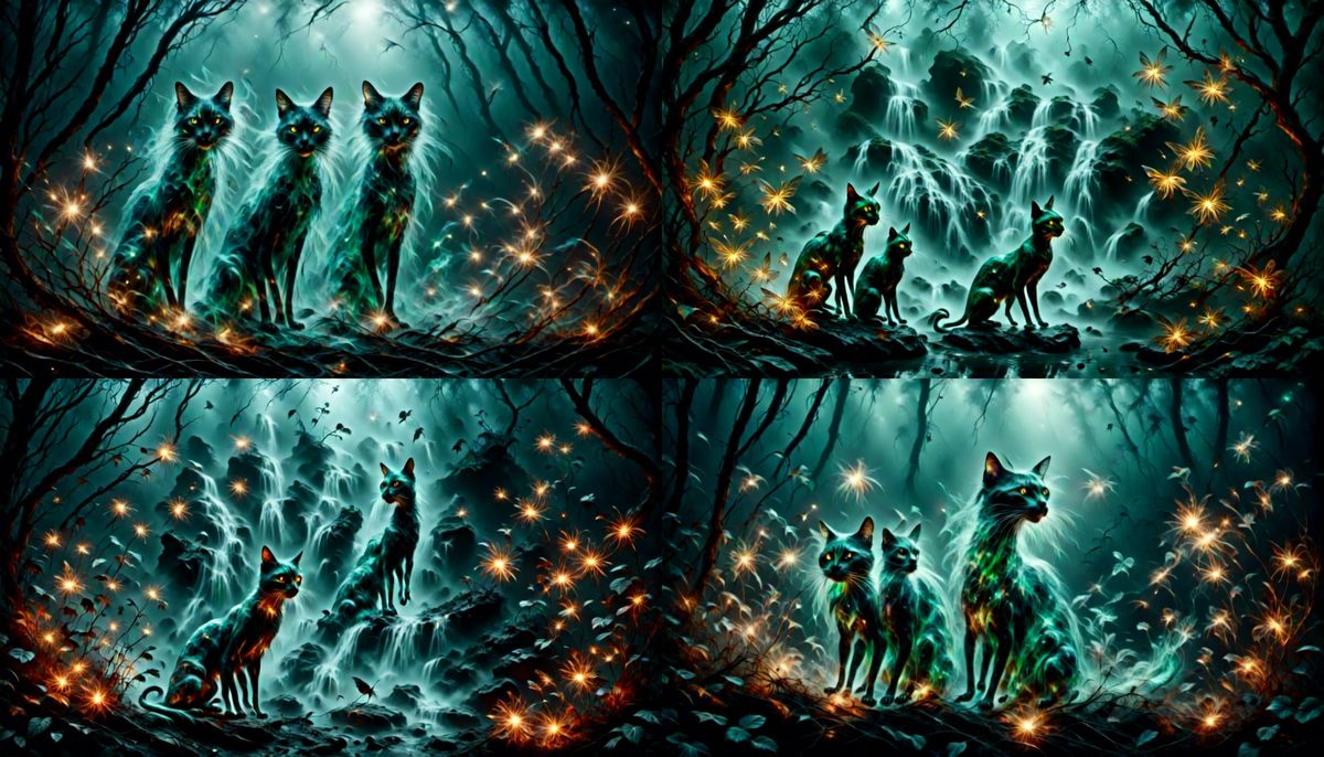 A transparent ghost cat with piercing green eyes bursts forth from a magical forest. Brightly colored birds fly over a magnificent waterfall in the background. The ethereal cat has a faint glow.
